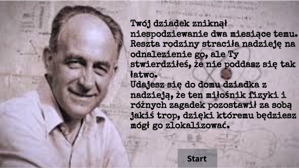 Twój dziadek zniknął niespodziewanie dwa miesiące temu. Reszta rodziny straciła nadzieję na odnalezienie go, ale Ty stwierdziłeś, że nie poddasz się tak łatwo. Udajesz się do domu dziadka z nadzieją, że ten miłośnik fizyki i różnych zagadek pozostawił za sobą jakiś trop, dzięki któremu będziesz mógł go zlokalizować.