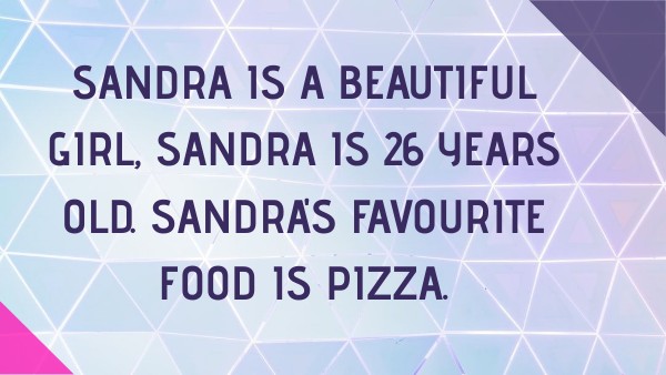 Sandra is a beautiful girl, Sandra is 26 years old. Sandra's favourite food is pizza.