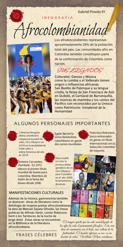 Culturales: Danzas y Músicacomo la cumbia y el Vallenato tienen origen o influencias africanas. San Basilio de Palenque y su lengua criolla, la fiesta de San Francisco de Asís en Quibdó, el Carnaval de Barranquilla, las músicas de marimba y los cantos del Pacífico son reconocidos por la Unesco como Patrimonio Inmaterial de la Humanidad