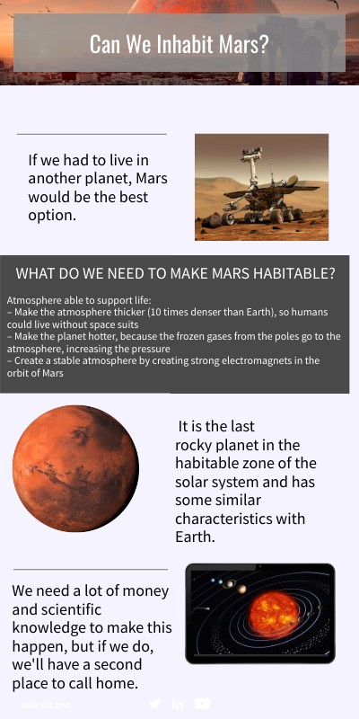 Atmosphere able to support life: – Make the atmosphere thicker (10 times denser than Earth), so humans could live without space suits – Make the planet hotter, because the frozen gases from the poles go to the atmosphere, increasing the pressure – Create a stable atmosphere by creating strong electromagnets in the orbit of Mars
