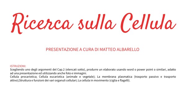 ISTRUZIONI: Scegliendo uno degli argomenti del Cap.2 (elencati sotto), produrre un elaborato usando word o power point o similari, adatto ad una presentazione ed utilizzando anche foto e immagini. Cellula procariotica; Cellula eucariotica (animale e vegetale); La membrana plasmatica (trasporto passivo e trasporto attivo);Struttura e funzioni dei vari organuli cellulari; La cellula in movimento (ciglia e flagelli).
