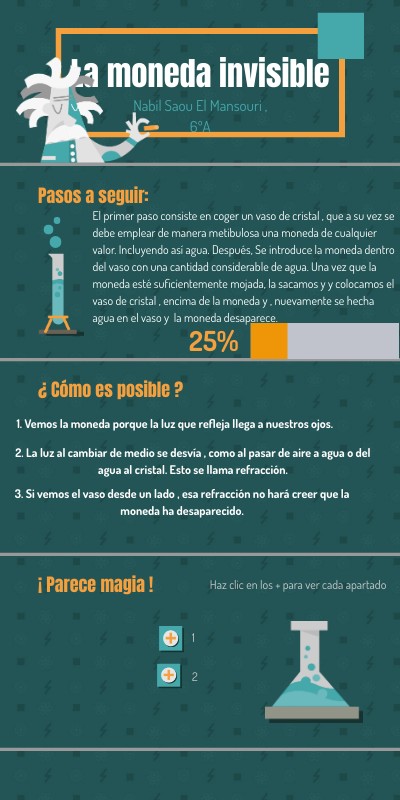 El primer paso consiste en coger un vaso de cristal , que a su vez se debe emplear de manera metibulosa una moneda de cualquier valor. Incluyendo así agua. Después, Se introduce la moneda dentro del vaso con una cantidad considerable de agua. Una vez que la moneda esté suficientemente mojada, la sacamos y y colocamos el vaso de cristal , encima de la moneda y , nuevamente se hecha agua en el vaso y la moneda desaparece.