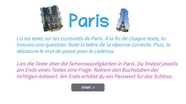 Lis les texte sur les curiosités de Paris. À la fin de chaque texte, tu trouves une question. Note la lettre de la réponse correcte. Puis, tu découvre le mot de passe pour le cadenas. Lies die Texte über die Sehenswürdigkeiten in Paris. Du findest jeweils am Ende eines Textes eine Frage. Notiere den Buchstaben der richtigen Antwort. Am Ende erhälst du ein Passwort für das Schloss.