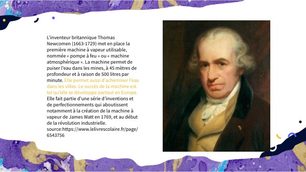 L’inventeur britannique Thomas Newcomen (1663‑1729) met en place la première machine à vapeur utilisable, nommée « pompe à feu » ou « machine atmosphérique ». La machine permet de puiser l’eau dans les mines, à 45 mètres de profondeur et à raison de 500 litres par minute. Elle permet aussi d’acheminer l’eau dans les villes. Le succès de la machine est tel qu’elle se développe partout en Europe. Elle fait partie d’une série d’inventions et de perfectionnements qui aboutissent notamment à la création de la machine à vapeur de James Watt en 1769, et au début de la révolution industrielle. source:https://www.lelivrescolaire.fr/page/6543756