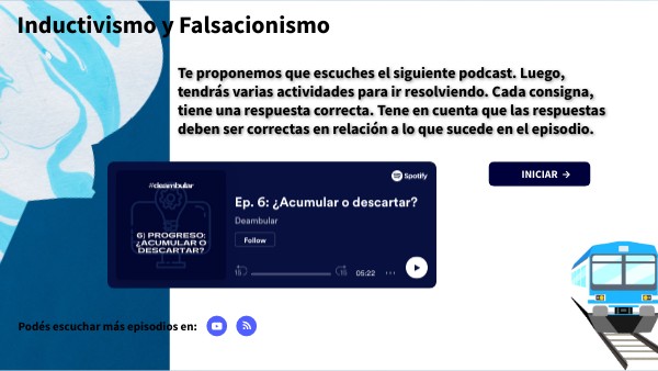 Te proponemos que escuches el siguiente podcast. Luego, tendrás varias actividades para ir resolviendo. Cada consigna, tiene una respuesta correcta. Tene en cuenta que las respuestas deben ser correctas en relación a lo que sucede en el episodio.