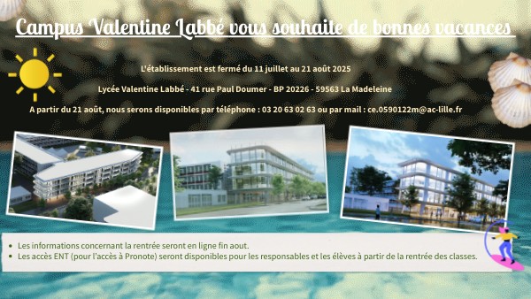 L'établissement est fermé du 11 juillet au 21 août 2025 Lycée Valentine Labbé - 41 rue Paul Doumer - BP 20226 - 59563 La Madeleine A partir du 21 août, nous serons disponibles par téléphone : 03 20 63 02 63 ou par mail : ce.0590122m@ac-lille.fr