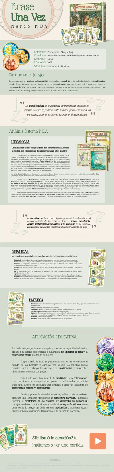 Erase una vez es un juego de cartas narrativo, que consiste en construir, entre todos los jugadores, una historia o cuento. Para ello, cada jugador dispone de varias cartas de narración, con elementos de los cuentos clásicos, y una carta de final. Para ganar hay que conseguir descartarse de las cartas de narración, introduciendo los elementos en el cuento, y luego concluir la historia como indique la carta de final.