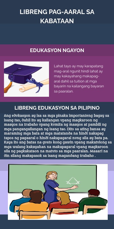 Ang edukasyon ay isa sa mga pinaka importanteng bagay sa isang tao, dahil ito ay kailangan upang magkaroon ng maayos na trabaho upang kumita ng maayos at pambili ng mga pangangailangan ng isang tao. Dito sa ating bansa ay maraming mga bata at mga matatanda na hindi nakapag tapos ng pagaaral o hindi nakapagaral nung sila ay bata pa. Kaya ito ang batas na gusto kong gawin upang makatulong sa mga walang kakayahan na makapagaral upang magkaroon sila ng pagkakataon na matuto sa mga paaralan. Maaari na din silang makapasok sa isang magandang trabaho .