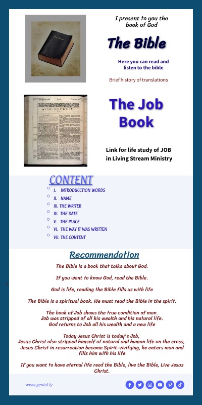 La Biblia es un libro que habla de Dios. Si quieres conocer a Dios, lee la Biblia. Dios es vida, leer la Biblia nos llena de vida. La Biblia es un libro espiritual. Debemos leer la Biblia en el espíritu. El libro de Job muestra la verdadera condición del hombre. Job fue despojado de todas sus riquezas y de su vida natural. Dios le devuelve a Job todas sus riquezas aumentadas y una vida transformada. Hoy Jesucristo es el trabajo de hoy, Jesucristo también se despojó de la vida natural y humana en la cruz, Jesucristo en resurrección se volvió vivificante del Espíritu, entra al hombre y lo llena con su vida Si quieres tener vida eterna lee la Biblia, vive la Biblia, vive a Jesucristo .