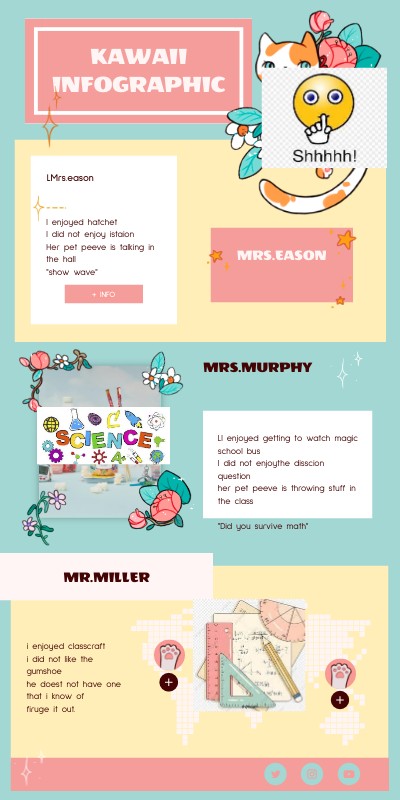 I enjoyed hatchetI did not enjoy istaion Her pet peeve is talking in the hall "show wave"