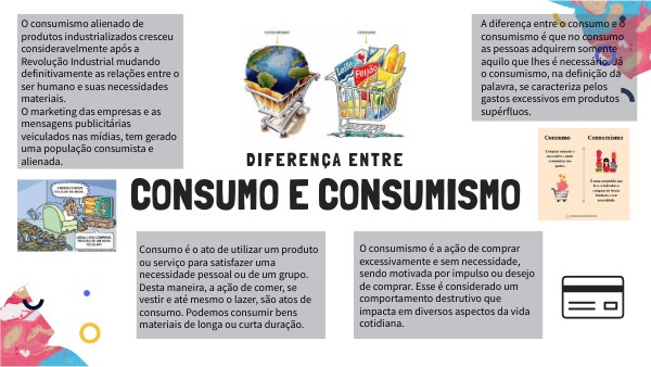 A diferença entre o consumo e o consumismo é que no consumo as pessoas adquirem somente aquilo que lhes é necessário. Já o consumismo, na definição da palavra, se caracteriza pelos gastos excessivos em produtos supérfluos.