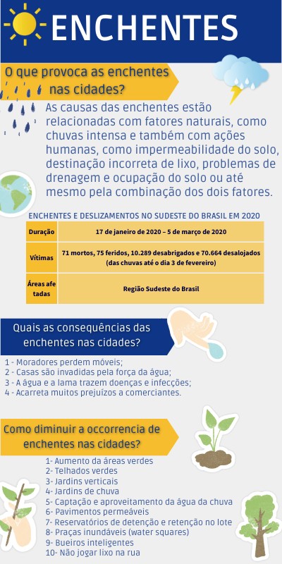As causas das enchentes estão relacionadas com fatores naturais, como chuvas intensa e também com ações humanas, como impermeabilidade do solo, destinação incorreta de lixo, problemas de drenagem e ocupação do solo ou até mesmo pela combinação dos dois fatores.