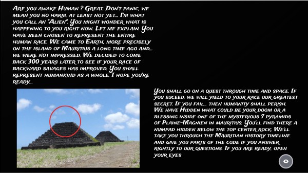 You shall go on a quest through time and space. If you suceed, we will yield to your race our greatest secret. If you fail... then humanity shall perish. We have Hidden what could be your doom or a blessing inside one of the mysterious 7 pyramids of Plaine-Magnien in mauritius. You'll find there a numpad hidden below the top center rock. We'll take you through the Mauritian history timeline and give you parts of the code if you answer rightly to our questions. If you are ready, open your eyes