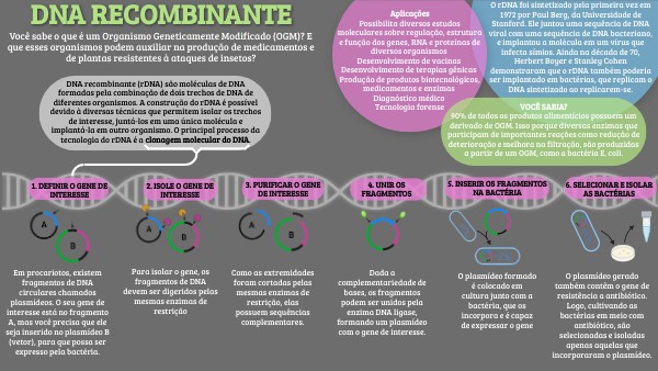 DNA recombinante (rDNA) são moléculas de DNA formadas pela combinação de dois trechos de DNA de diferentes organismos. A construção do rDNA é possível devido à diversas técnicas que permitem isolar os trechos de interesse, juntá-los em uma única molécula e implantá-la em outro organismo. O principal processo da tecnologia do rDNA é a clonagem molecular do DNA.