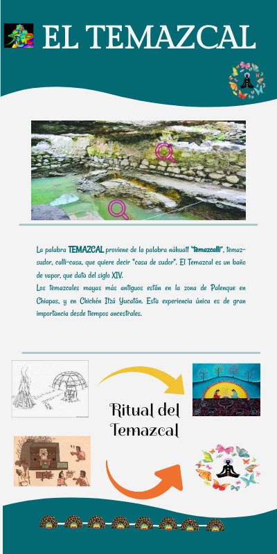 La palabra TEMAZCAL proviene de la palabra náhuatl “temazcalli”, temaz-sudor, calli-casa, que quiere decir “casa de sudor”. El Temazcal es un baño de vapor, que data del siglo XIV. Los temazcales mayas más antiguos están en la zona de Palenque en Chiapas, y en Chichén Itzá Yucatán. Esta experiencia única es de gran importancia desde tiempos ancestrales.