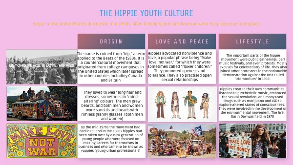 Began in the United States during the mid-1960s. Allen Ginsberg and Jack Kerouac were the precursors of hippies