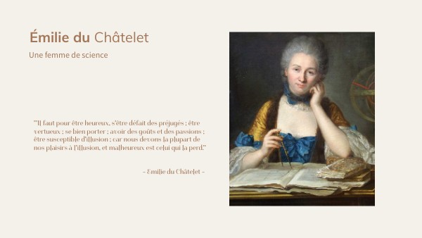 .Emilie est une femme savante qui excellait dans toute les matières : scientifique comme littéraire, elle à été traductrice, physicienne, mathématicienne, philosophe et écrivaine