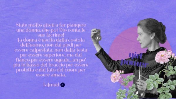IL Talmud dice: State molto atteti a far piangere una donna, che poi Dio conta le sue lacrime! La donna è uscita dalla costola dell'uomo, non dai piedi per essere calpestata, non dalla testa per essere superiore, ma dal fianco per essere uguale...un po' più in basso del braccio per essere protetta e dal lato del cuore per essere amata.