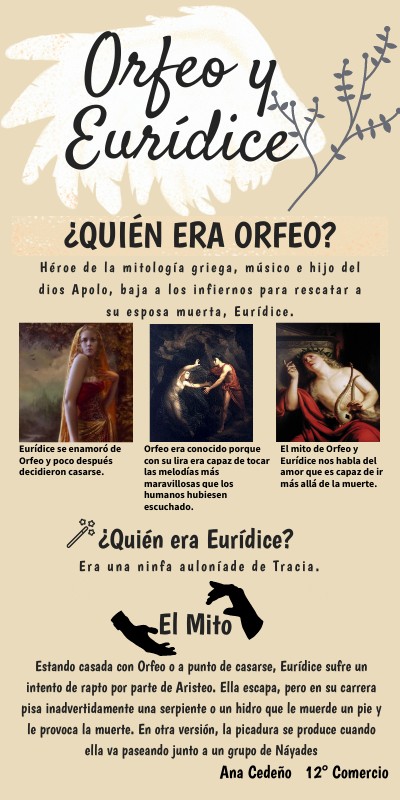Héroe de la mitología griega, músico e hijo del dios Apolo, baja a los infiernos para rescatar a su esposa muerta, Eurídice.