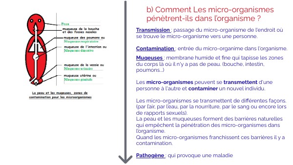 Muqeuses : membrane humide et fine qui tapisse les zones du corps là où il n'y a pas de peau. (bouche, intestin, poumons...) Les micro-organismes peuvent se transmettent d'une personne à l'autre et contaminer un nouvel individu. Les micro-organismes se transmettent de différentes façons. (par l’air, par l’eau, par la nourriture, par le sang ou encore lors de rapports sexuels). La peau et les muqueuses forment des barrières naturelles qui empêchent la pénétration des micro-organismes dans l’organisme. Quand les micro-organismes franchissent ces barrières il y a contamination. Pathogène : qui provoque une maladie