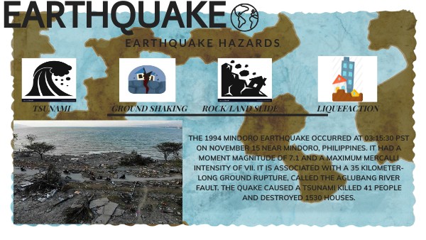 The 1994 Mindoro earthquake occurred at 03:15:30 PST on November 15 near Mindoro, Philippines. It had a moment magnitude of 7.1 and a maximum Mercalli intensity of VII. It is associated with a 35 kilometer-long ground rupture, called the Aglubang River fault. The quake caused a tsunami killed 41 people and destroyed 1530 houses.