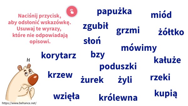 Naciśnij przycisk, aby odsłonić wskazówkę. Usuwaj te wyrazy, które nie odpowiadają opisowi.