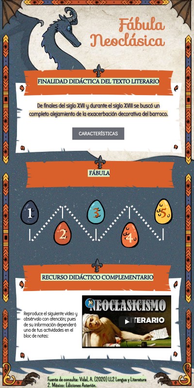 Infografía sobre generalidades del Neoclasicismo y las características de la fábula como recurso literario didáctico.