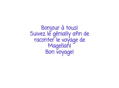 Bonjour à tous! Suivez le génially afin de raconter le voyage de Magellan! Bon voyage!