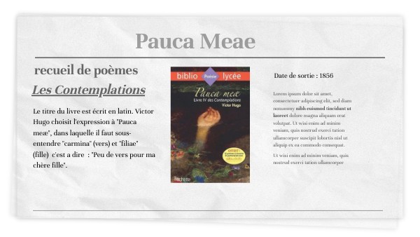 Le titre du livre est écrit en latin. Victor Hugo choisit l'expression à "Pauca meæ", dans laquelle il faut sous-entendre "carmina" (vers) et "filiae" (fille) c'est a dire : "Peu de vers pour ma chère fille".