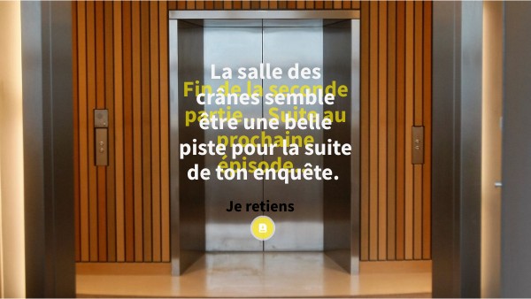 La salle des crânes semble être une belle piste pour la suite de ton enquête.