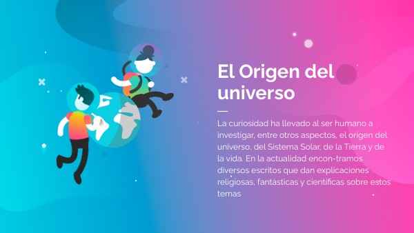 La curiosidad ha llevado al ser humano a investigar, entre otros aspectos, el origen del universo, del Sistema Solar, de la Tierra y de la vida. En la actualidad encon-tramos diversos escritos que dan explicaciones religiosas, fantásticas y científicas sobre estos temas