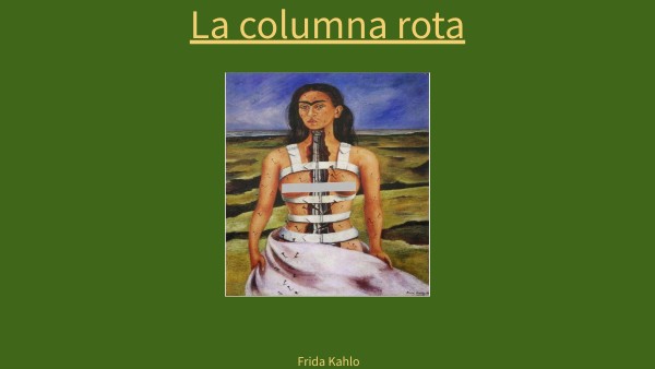 Este es un autorretrato de Frida Kahlo,ella se representa a sí misma parada en medio de la pintura solo con como fondo el desierto que representa su sufrimiento.En este cuadro podemos ver a frida con la columna rota tras el accidente de autobús que sufrió cuando era más joven,también podemos ver muchos clavos que representan sus muchas operaciones o todos sus dolores. Los colores es : azul ,blanco ,verde ,negro y amarillo.