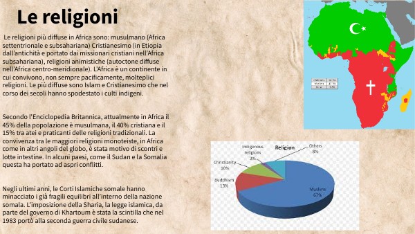 Le religioni più diffuse in Africa sono: musulmano (Africa settentrionale e subsahariana) Cristianesimo (in Etiopia dall’antichità e portato dai missionari cristiani nell’Africa subsahariana), religioni animistiche (autoctone diffuse nell’Africa centro-meridionale). L'Africa è un continente in cui convivono, non sempre pacificamente, molteplici religioni. Le più diffuse sono Islam e Cristianesimo che nel corso dei secoli hanno spodestato i culti indigeni. Secondo l'Enciclopedia Britannica, attualmente in Africa il 45% della popolazione è musulmana, il 40% cristiana e il 15% tra atei e praticanti delle religioni tradizionali. La convivenza tra le maggiori religioni monoteiste, in Africa come in altri angoli del globo, è stata motivo di scontri e lotte intestine. In alcuni paesi, come il Sudan e la Somalia questa ha portato ad aspri conflitti. Negli ultimi anni, le Corti Islamiche somale hanno minacciato i già fragili equilibri all’interno della nazione somala. L'imposizione della Sharia, la legge islamica, da parte del governo di Khartoum è stata la scintilla che nel 1983 portò alla seconda guerra civile sudanese.