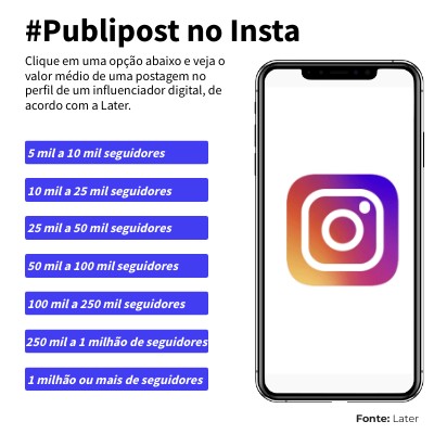 Clique em uma opção abaixo e veja o valor médio de uma postagem no perfil de um influenciador digital, de acordo com a Later.