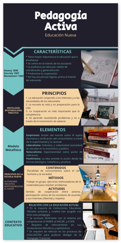 1. La educación responde a los intereses y a las necesidades de los educandos2. La escuela es vida y no preparación para la vida 3. La cooperación es más importante que la competencia 4. Se aprende resolviendo problemas y no a través de la transmisión de saberes