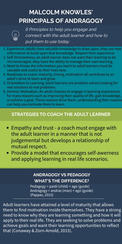 - Empathy and trust - a coach must engage with the adult learner in a manner that is not judgemental but develops a relationship of mutual respect.