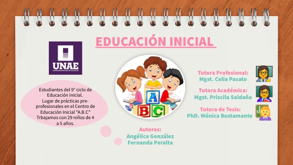 Estudiantes del 9° ciclo de Educación Inicial. Lugar de prácticas pre-profesionales en el Centro de Educación Inicial "A.B.C" Trbajamos con 29 niños de 4 a 5 años.
