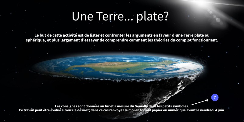 Le but de cette activité est de lister et confronter les arguments en faveur d'une Terre plate ou sphérique, et plus largement d'essayer de comprendre comment les théories du complot fonctionnent.