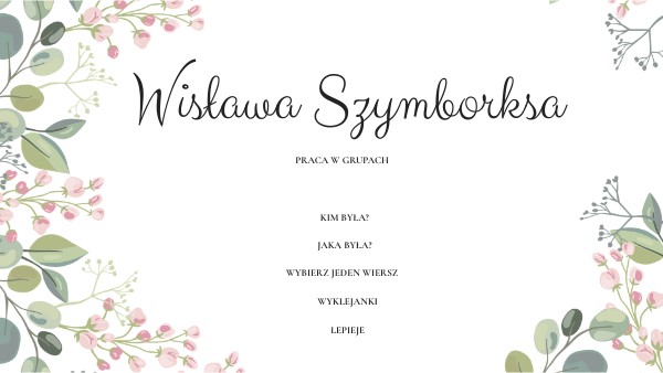 Obejrzeliście film dokumentalny, wysłuchaliście wypowiedzi różnych osób. Jakie są wasze refleksje? Jaką osobą ,jaka poetką była Pani Szymborska? Stwórzcie ciekawą mapę myśli z epitetami, porównaniami, metaforami, które ją określają.