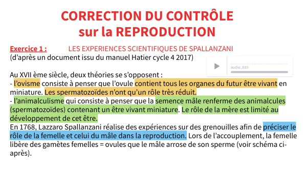 Exercice 1 : LES EXPERIENCES SCIENTIFIQUES DE SPALLANZANI (suite) 1. C4/C17 Quel problème scientifique L. Spallanzani a-t-il voulu résoudre ? Spallanzani voulait savoir quel est le rôle respectif des spermatozoïdes et des ovules dans la reproduction sexuée. --> voir explication sur la première diapositive. 2. C4/C17 Parmi les 3 montages (M1, M2 et M3) de L. Spallanzani, quel est le montage témoin et à quoi sert-il ? Le montage témoin sert de point de comparaison/ de point de repère: c'est celui qui reconstitue les conditions normales: il s'agit donc ici du montage M1. --> voir explication sur la seconde diapositive. 3. C4/C17 Quelle hypothèse L. Spallanzani teste-t-il dans cette expérience ? D'après le texte et le schéma de l'expérience, on comprend que Spallanzani n'est pas d'accord avec les théories de l'ovisme et de l'animalculisme. Il pense que les deux types de gamètes sont nécessaires pour que la reproduction sexuée fonctionne.