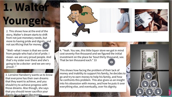 3. Lorraine Hansberry wants us to know that everyone has their own dreams that they want to achieve, and you should try to achieve progress with those dreams. Also though, she says that you should never sacrifice your dignity for a dream like money.