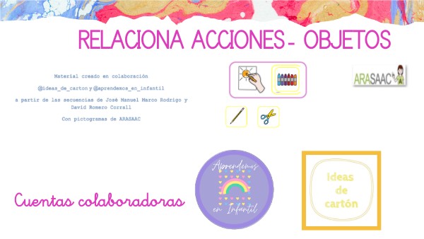 DESCRIPCIÓN: Este material está pensado para trabajar la relación entre las acciones y los objetos. En primer lugar, habrá que observar la acción y después poner qué objeto se necesita en el lugar designado para ello.En este caso, hemos decidido acompañarlo de unas plantillas manipulativas y visuales, así facilitamos el aprendizaje. Además, este material se complementa con un juego de Genially con el que se pretende generalizar su aprendizaje de una manera mucho más lúdica. Este juego está pensado para trabajar con todos los niñ@s, al ser tan visual es ideal para niñ@s con trastorno del espectro autista (TEA).