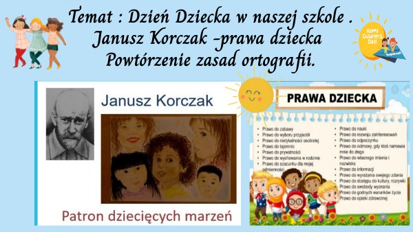 Temat : Dzień Dziecka w naszej szkole . Janusz Korczak -prawa dziecka Powtórzenie zasad ortografii.