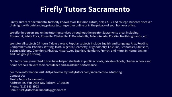 Firefly Tutors of Sacramento, formerly known as A+ In Home Tutors, helps K-12 and college students discover their light with outstanding private tutoring either online or in the privacy of your home or office. We offer in-person and online tutoring services throughout the greater Sacramento area, including Rosemont, White Rock, Roseville, Clarksville, El Dorado Hills, Arden-Arcade, Rocklin, North Highlands, etc. We tutor all subjects 24 hours 7 days a week. Popular subjects include English and Language Arts, Reading Comprehension, Phonics, Writing, Math, Algebra, Geometry, Trigonometry, Calculus, Economics, Statistics, Science, Biology, Chemistry, Physics, History, Art, Spanish, Mandarin, French, and more. In-Home, Online, and Pod group tutoring. Our individually matched tutors have helped students in public schools, private schools, charter schools and home schools elevate their confidence and academic performance. For more information visit - https://www.myfireflytutors.com/sacramento-ca-tutoring Contact Us: Firefly Tutors Sacramento Address: 409 Van Dyke Way Folsom, CA 95630 Phone: (916) 883-3923 Email: fireflytutorssacramento@gmail.com