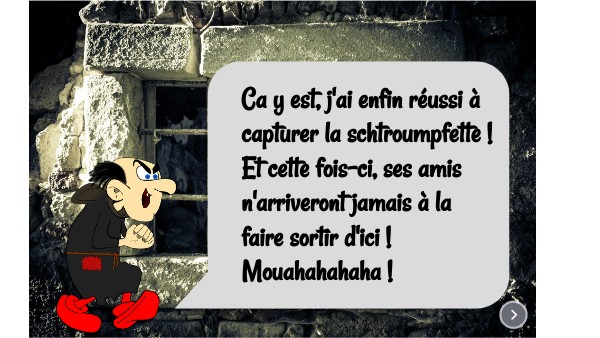 Ca y est, j'ai enfin réussi à capturer la schtroumpfette ! Et cette fois-ci, ses amis n'arriveront jamais à la faire sortir d'ici ! Mouahahahaha !