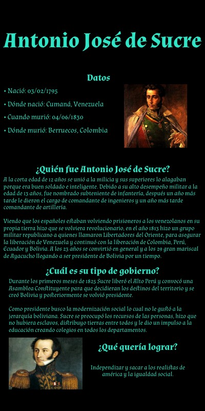 • Nació: 03/02/1795 • Dónde nació: Cumaná, Venezuela • Cuando murió: 04/06/1830 • Dónde murió: Berruecos, Colombia