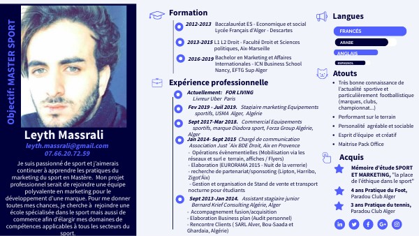 Je suis passionné de sport et j’aimerais continuer à apprendre les pratiques du marketing du sport en Mastère. Mon projet professionnel serait de rejoindre une équipe polyvalente en marketing pour le développement d’une marque. Pour me donner toutes mes chances, je cherche à rejoindre une école spécialisée dans le sport mais aussi de commerce afin d’élargir mes domaines de compétences applicables à tous les secteurs du sport.