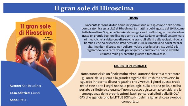 GIUDIZIO PERSONALE Nonostante ci sia un finale molto triste l’autore è riuscito a raccontare gli orrori della guerra e la grande tragedia di Hiroshima attraverso lo sguardo innocente di una ragazzina che vive tutti i giorni questa cruda realtà e ne porta i segni non solo psicologici sulla propria pelle, e mi ha portato a riflettere su quanto l’uomo spesso agisca senza considerare le conseguenze delle proprie azioni, basti pensare ai piloti della ENOLA GAY che sganciarono la LITTLE BOY su Hiroshima ignari di cosa avrebbe comportato.