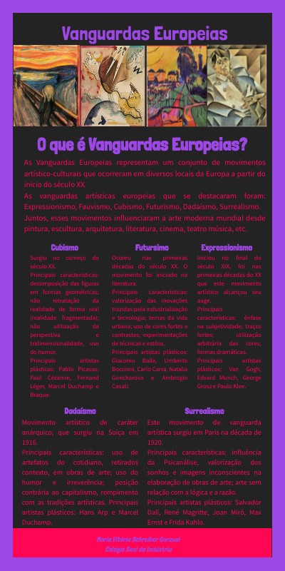 As Vanguardas Europeias representam um conjunto de movimentos artístico-culturais que ocorreram em diversos locais da Europa a partir do início do século XX. As vanguardas artísticas europeias que se destacaram foram: Expressionismo, Fauvismo, Cubismo, Futurismo, Dadaísmo, Surrealismo. Juntos, esses movimentos influenciaram a arte moderna mundial desde pintura, escultura, arquitetura, literatura, cinema, teatro música, etc.