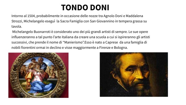 Intorno al 1504, probabilmente in occasione delle nozze tra Agnolo Doni e Maddalena Strozzi, Michelangelo eseguì la Sacra Famiglia con San Giovannino in tempera grassa su tavola. Michelangelo Buonarroti è considerato uno dei più grandi artisti di sempre. Le sue opere influenzeranno a tal punto l’arte italiana da creare una scuola a cui si ispireranno gli artisti successivi, che prende il nome di “Manierismo”.Esso è nato a Caprese da una famiglia di nobili fiorentini ormai in declino e visse maggiormente a Firenze e Bologna.